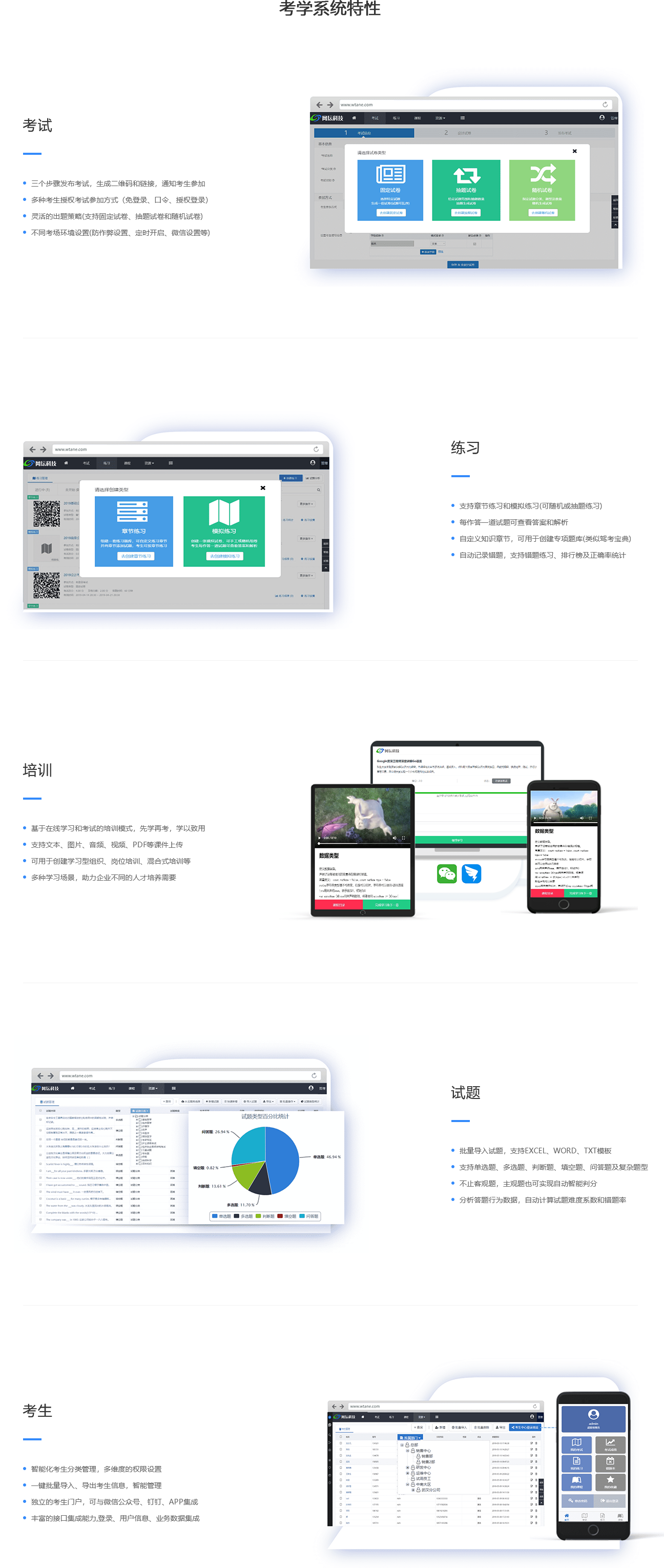 組卷出題(支持固定試卷、隨機試卷、抽題試卷),批量導入試題,設置分數等