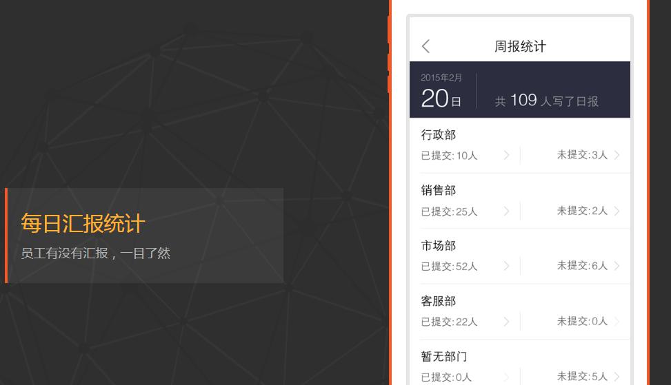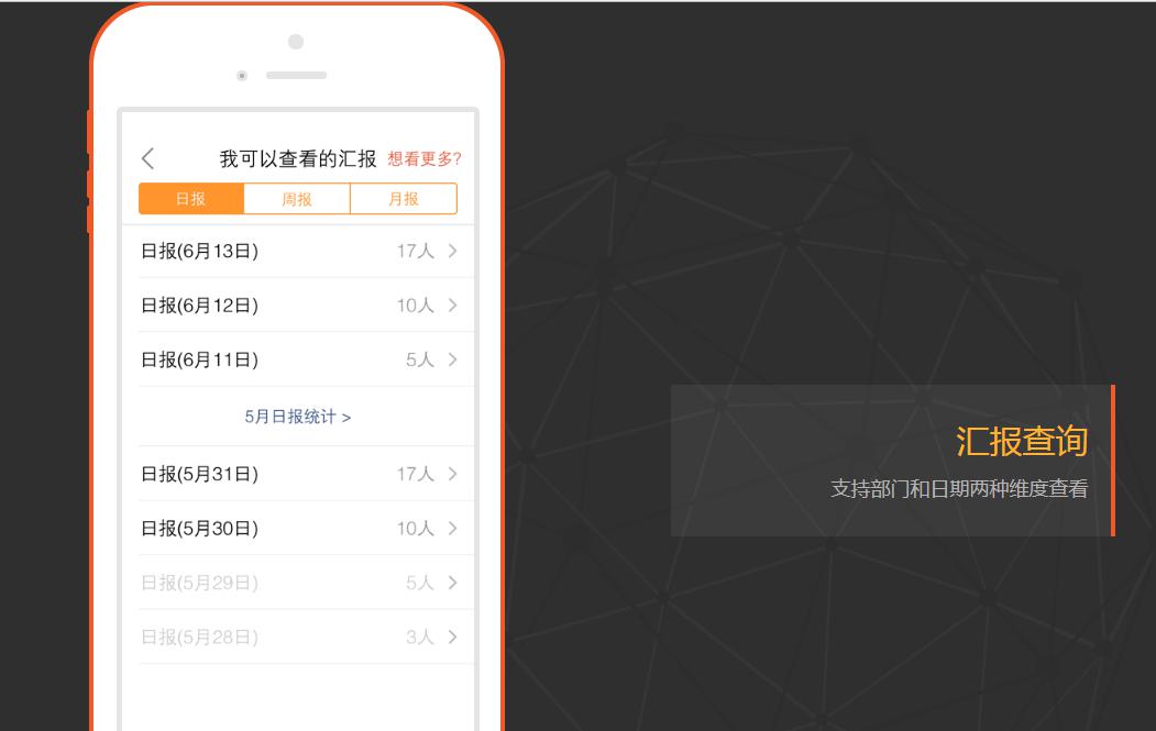 員工將每天的工作記錄下來,讓管理者實時掌握員工動態(tài)。瀏覽方式跟微博一樣,還能及時點評。日報、周報、月報,隨時隨地,想寫就寫。每日匯報統(tǒng)計。