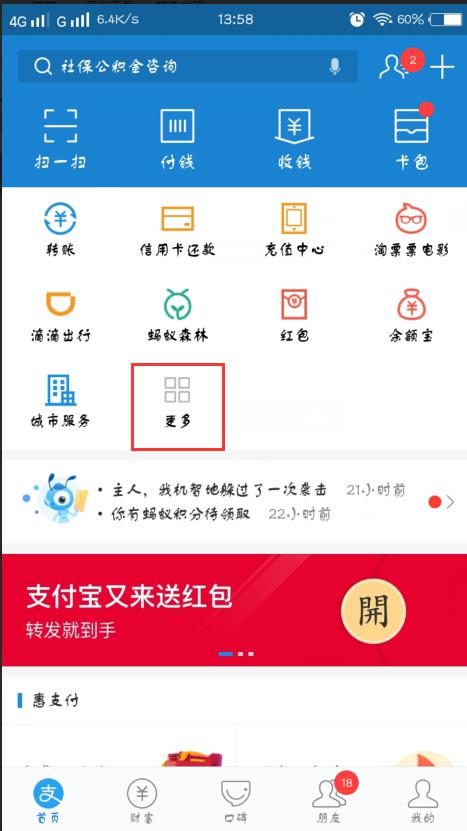 進入支付寶首頁中我們可以看到頁面可以添加的小程序,還可以展開更多進去查看。