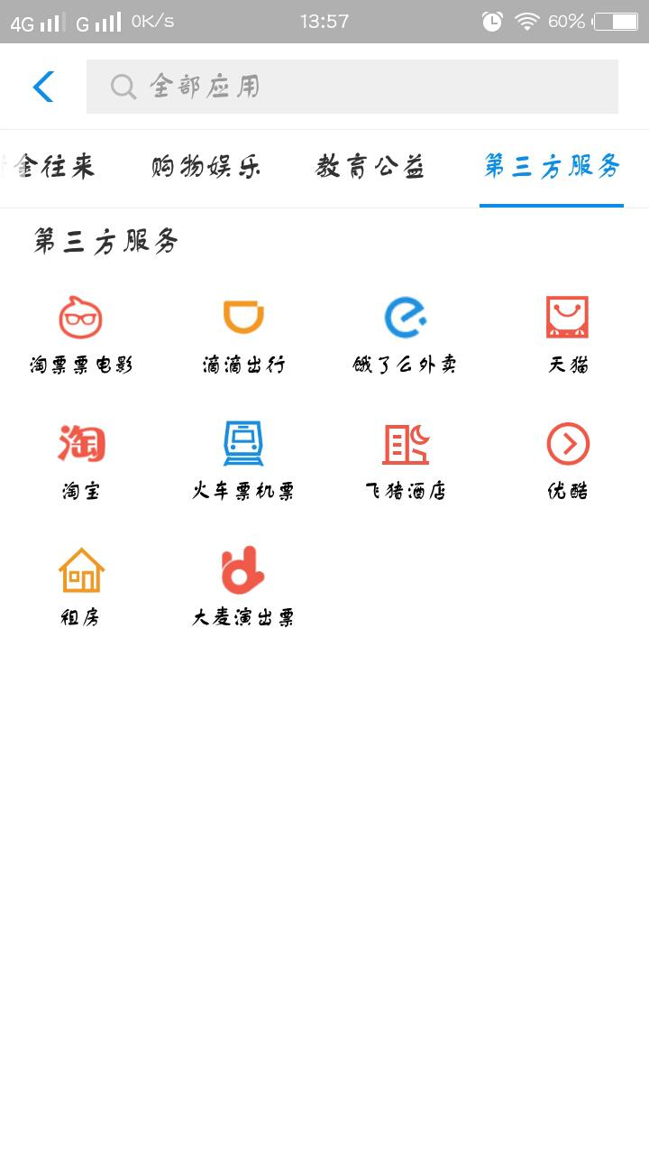 進入到全部應用的頁面中,可以看到第三方服務的這些小程序分別有:淘票票電影、滴滴出行、餓了么外賣、天貓、淘寶、火車票機票、飛豬酒店、優酷、租房、大麥演出票。