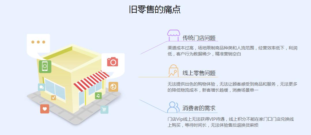 2、線上零售問題:無法提供出色的購物體驗,無法讓顧客感受到商品和服務,無法更多 的降低物流成本,新客增長趨緩,消費場景單一。