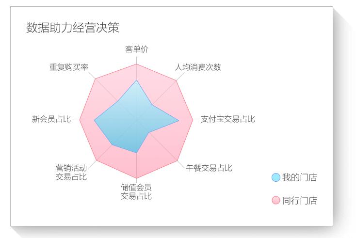 3、數據具體分析:每個階段的占比都會在系統里面分析出來,包括人均消費數量、支付寶交易占比、午餐交易占比、營銷活動交易占比、新會員占比、重復購買率、客單價等等。